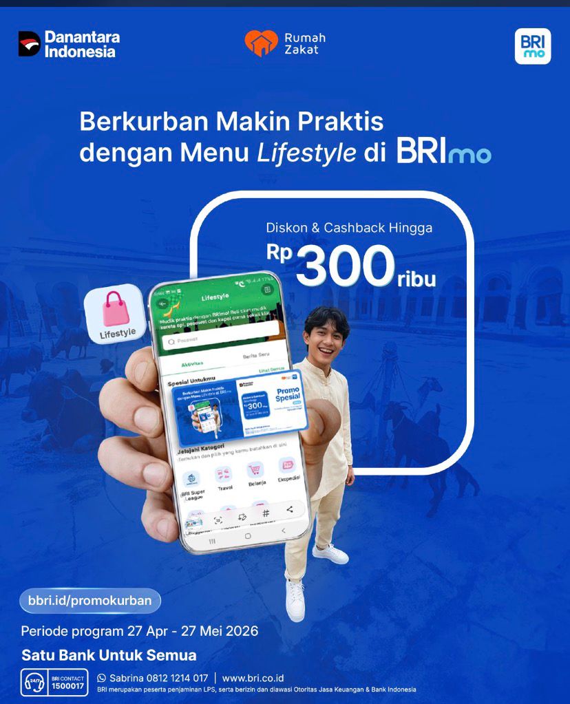 Program kolaborasi antara Rumah Zakat dan BRI ini juga memberikan keuntungan menarik berupa diskon dan cashback hingga Rp300.000, sehingga berkurban menjadi lebih ringan namun tetap penuh makna.