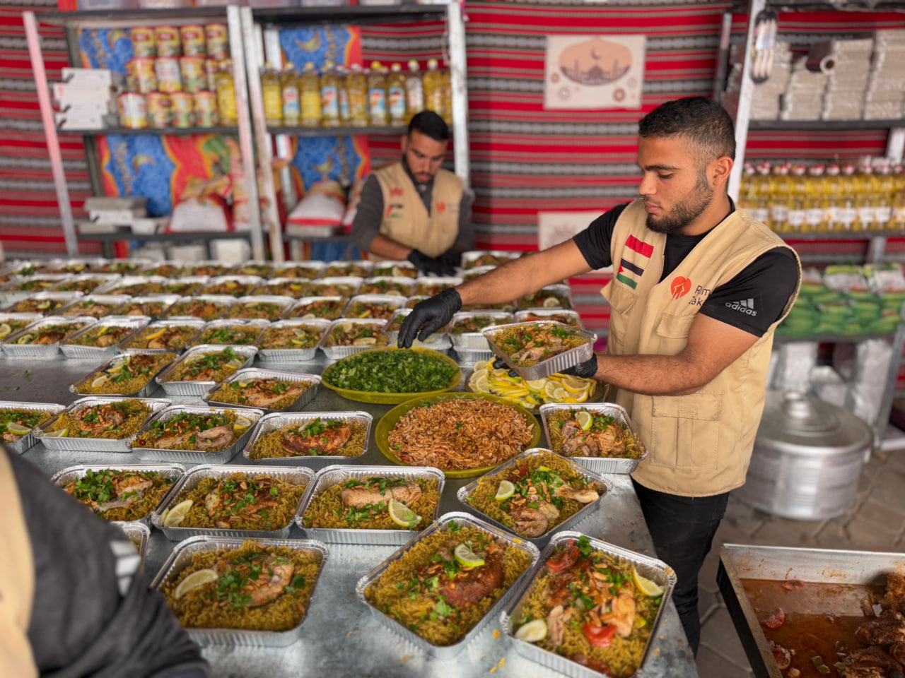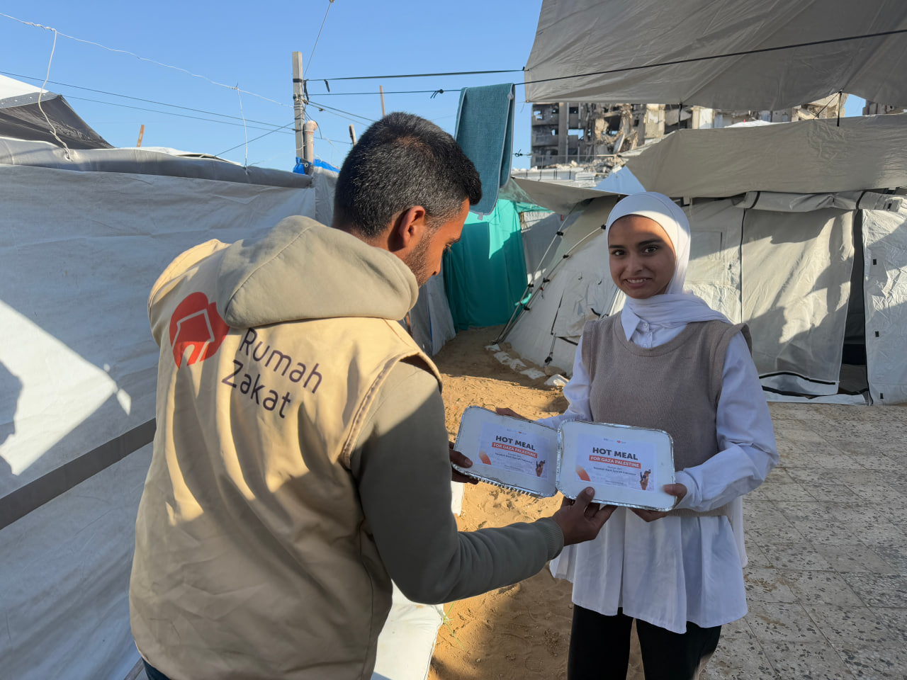 Sebanyak 2.000 porsi makanan berbuka bergizi yang berisi nasi, sayuran serta daging, diterima oleh 2.000 warga Palestina di Hunian Komunal Terintegrasi Rumah Zakat, Gaza Utara.