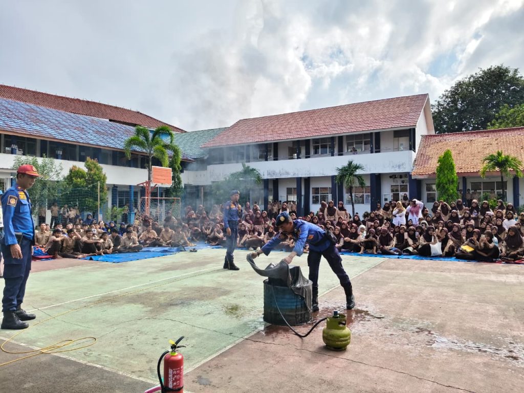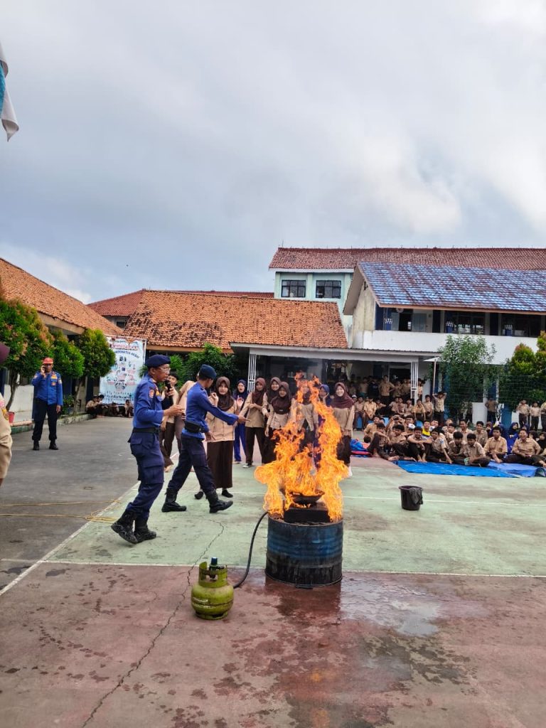 Tim Damkar memberikan simulasi penanganan kebakaran yang dipicu oleh kompor gas saat memasak. Para siswa pun diajak untuk langsung mempraktikkan cara memadamkan api dengan aman.