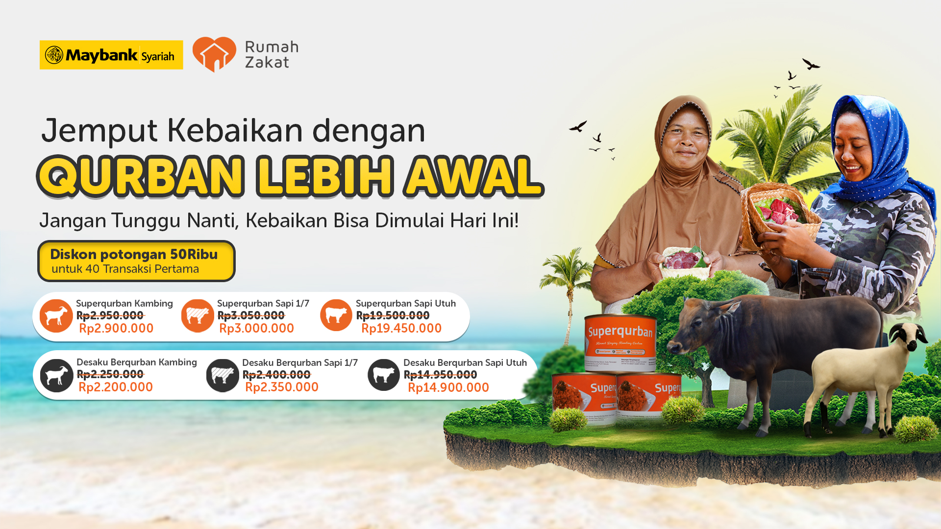 Rumah Zakat X MaybankJemput kebaikan dengan Qurban lebih awal. Desaku Berqurban KambingQurban Anda membahagiakan & MemberdayakanRp 2.200.000 Tunaikan Sekarang Desaku Berqurban 1/7 SapiQurban Anda membahagiakan & MemberdayakanRp 2.350.000 Tunaikan Sekarang Desaku Berqurban SapiQurban Anda membahagiakan & MemberdayakanRp 14.900.000 Tunaikan Sekarang Superqurban KambingSuperquban Manfaat Qurban anda, Jadi semakin luasRp 2.900.000 Kornet Rendang Superqurban Sapi 1/7Superqurban Sapi 1/7 Manfaat Qurban anda, Jadi semakin luasRp 3.000.000 Kornet Rendang Superqurban SapiSuperqurban Sapi Manfaat Qurban anda, Jadi semakin luasRp 19.450.000 Kornet Rendang