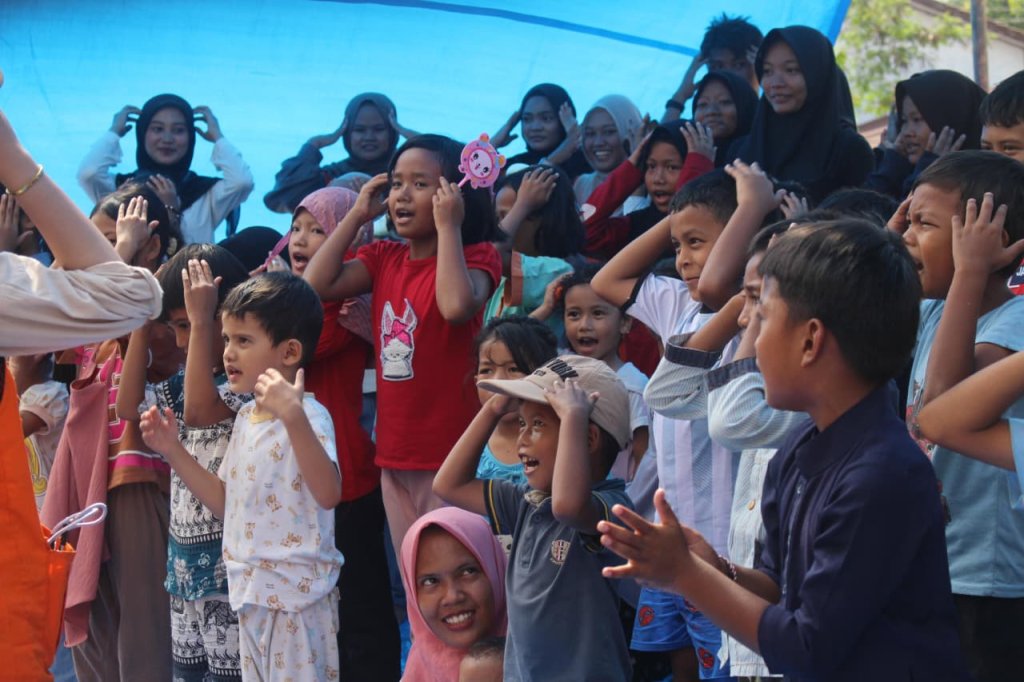 Suasana semakin meriah saat sesi mendongeng dimulai. Selain itu, hiburan trik sulap dari Kak Polan dan Kak Siddiq membuat anak-anak tertawa lepas. Wajah bahagia terlihat di sepanjang kegiatan. Dengan hiburan ini, anak-anak dapat menyalurkan emosi positif setelah mengalami bencana.