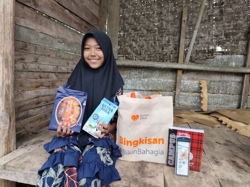 Salah satu anak binaan Rumah Zakat, Amanda, mengungkapkan rasa bahagianya setelah menerima bingkisan tersebut.