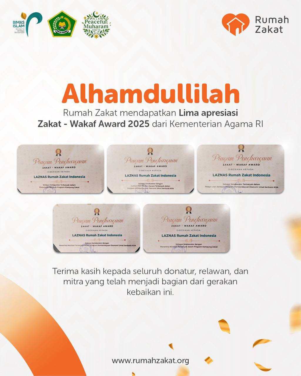 Rumah Zakat kembali menorehkan prestasi membanggakan dengan meraih lima apresiasi sekaligus dalam ajang Zakat-Wakaf Award 2025 yang diselenggarakan oleh Kementerian Agama Republik Indonesia.