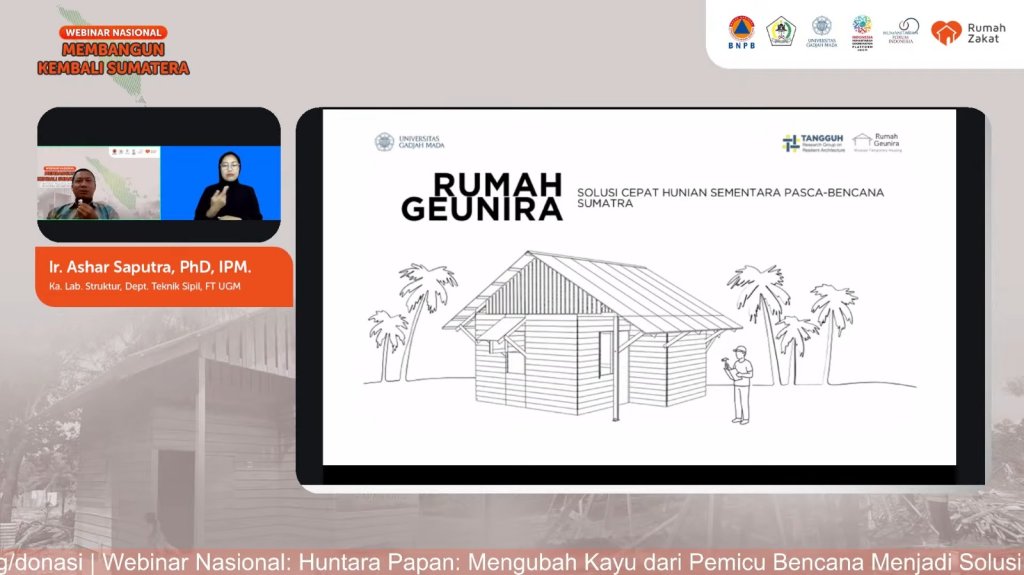 Dari sisi akademisi, Ir. Ashar Saputra, Ph.D., IPM., Kepala Laboratorium Struktur FT UGM, menjelaskan konsep Rumah Geunira. Rumah kayu ini dapat dibongkar pasang dan dibangun dalam waktu sekitar empat hari. Selain cepat, biaya pembangunan juga lebih rendah, sehingga cocok untuk kondisi darurat pascabencana.